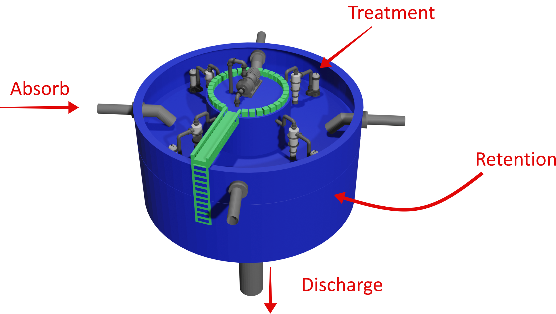 -Stored water undergoes basic treatment (e.g., sedimentation, filtration, clarifier tank).